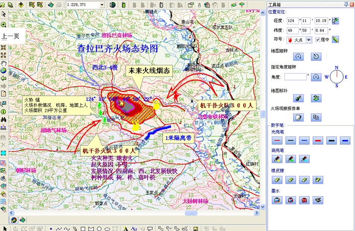 方便了觀(guān)察員在空中的作業(yè),觀(guān)察員可以用標(biāo)繪儀的“磁筆”把要反映的災(zāi)區(qū)信息標(biāo)繪在態(tài)勢(shì)圖上。方便專(zhuān)家標(biāo)繪火場(chǎng)。
