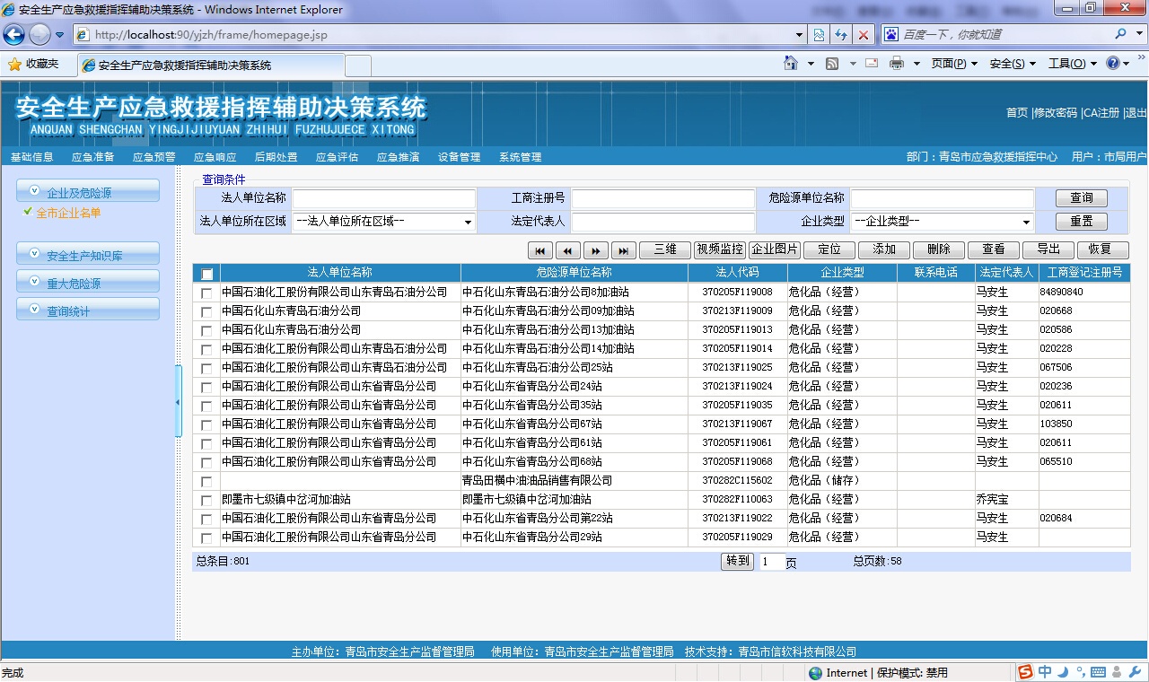 系統建成后可以滿足安監部門日常監管和戰時指揮調度要求;能加強日常安全監管工作,管理企業及重大危險源信息、安全生產知識庫、應急資源(專家、設備物資等)、數字化預案等,掌握重大危險源和應急資源的空間分布情況。