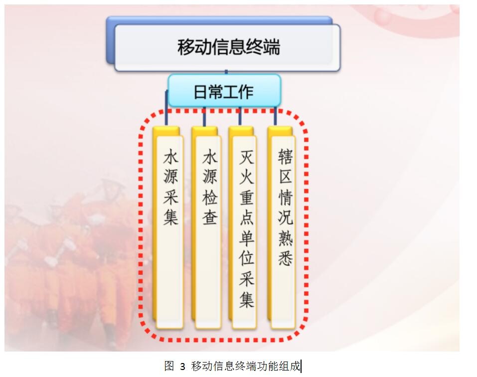 移動信息終端作為日常工作中中隊指揮員、戰(zhàn)士的信息采集工具,主要包括水源采集、水源檢查、滅火重點單位采集以及轄區(qū)情況熟悉四部分功能,功能組成如下圖所示: