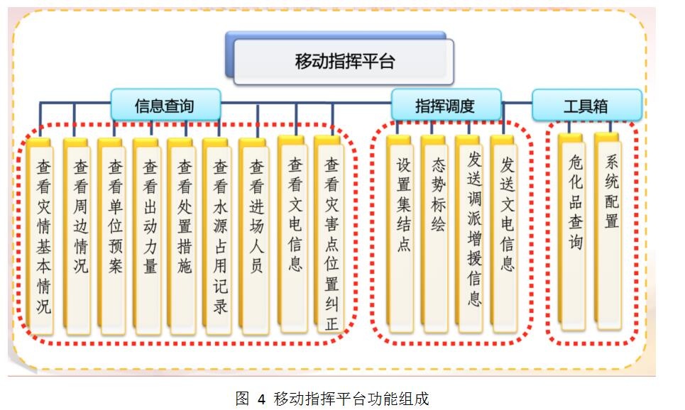 移動指揮平臺作為支隊及以上指揮員輔助指揮與決策的工具,主要包括信息查詢、指揮調(diào)度以及工具箱三部分功能。其中信息查詢主要包括查詢案件信息的相關功能,指揮調(diào)度主要包括發(fā)送指令的相關功能,工具箱包括危化品查詢和系統(tǒng)配置。移動指揮平臺的功能組成如下圖所示: