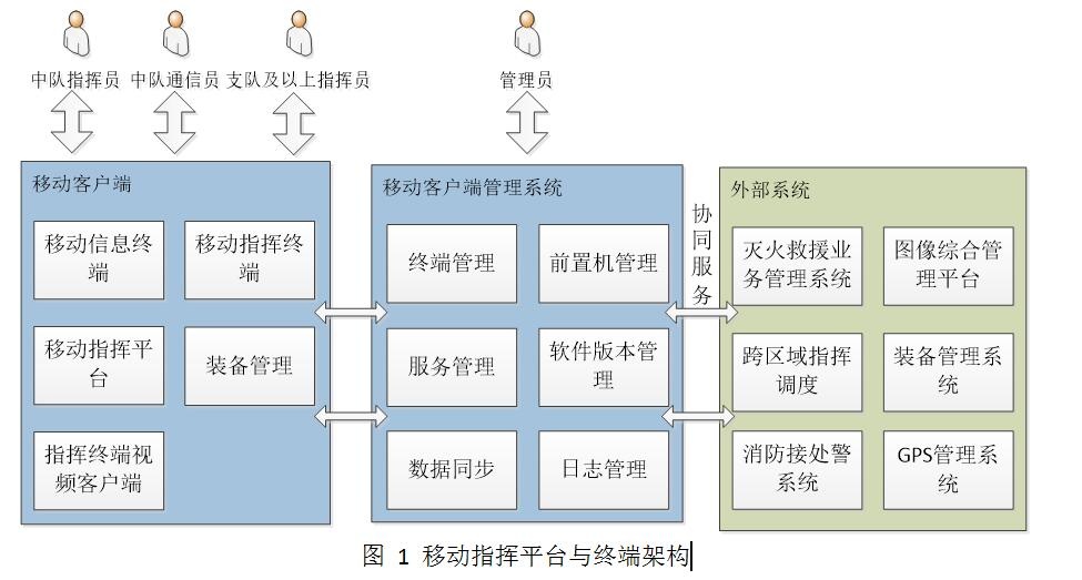 移動指揮平臺及終端與指揮網(wǎng)現(xiàn)有的業(yè)務管理系統(tǒng)、跨區(qū)域指揮調(diào)度系統(tǒng)、消防接處警系統(tǒng)、圖像綜合管理平臺、裝備管理系統(tǒng)以及GPS管理系統(tǒng)對接,實現(xiàn)了消息的互通,整體架構如下圖所示: