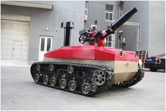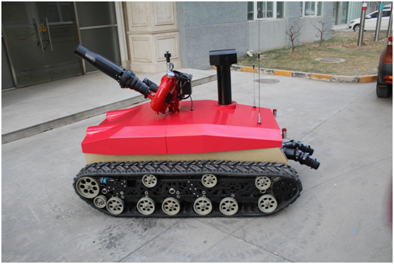 防爆消防滅火偵察機(jī)器人采用耐高溫履帶避震式底盤設(shè)計(jì),能夠適應(yīng)救援環(huán)境中各種復(fù)雜地面。裝配環(huán)境檢測裝置,在滅火的同時(shí)對(duì)現(xiàn)場環(huán)境數(shù)據(jù)進(jìn)行偵測。機(jī)器人由機(jī)器人主體,消防炮,環(huán)境檢測裝置,遙控箱四部分組成。主要作用是代替消防隊(duì)員進(jìn)入易燃易爆、有毒、缺氧、濃煙等危險(xiǎn)災(zāi)害事故現(xiàn)場實(shí)施有效的滅火救援、化學(xué)檢測和火場偵察。