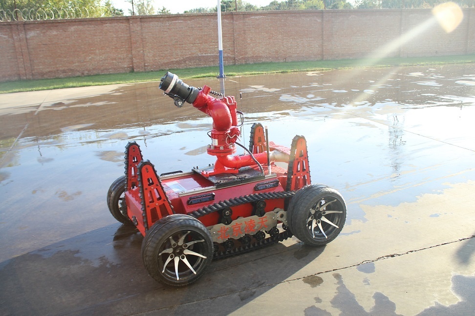 消防滅火機器人采用履帶+擺臂+輪式的底盤設計,能夠適應救援環境中各種復雜地面。裝配環境檢測裝置,在滅火的同時對現場環境數據進行偵測。消防滅火偵查機器人由機器人主體,消防炮,環境檢測裝置,遙控箱四部分組成。主要作用是代替消防隊員進入易燃易爆、有毒、缺氧、濃煙等危險災害事故現場實施有效的滅火救援、化學檢測和火場偵察。