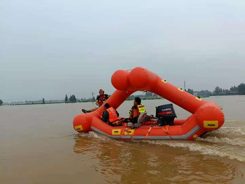 ▲凌天智能裝備自主研發的自扶正激流救生艇參與河南新鄉洪水救援。