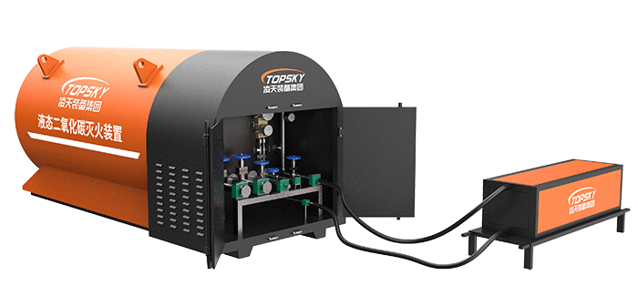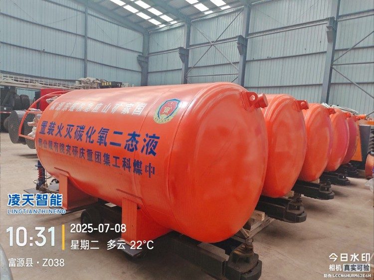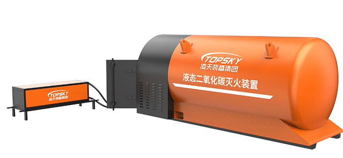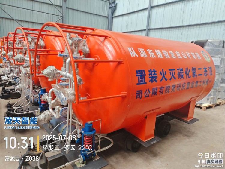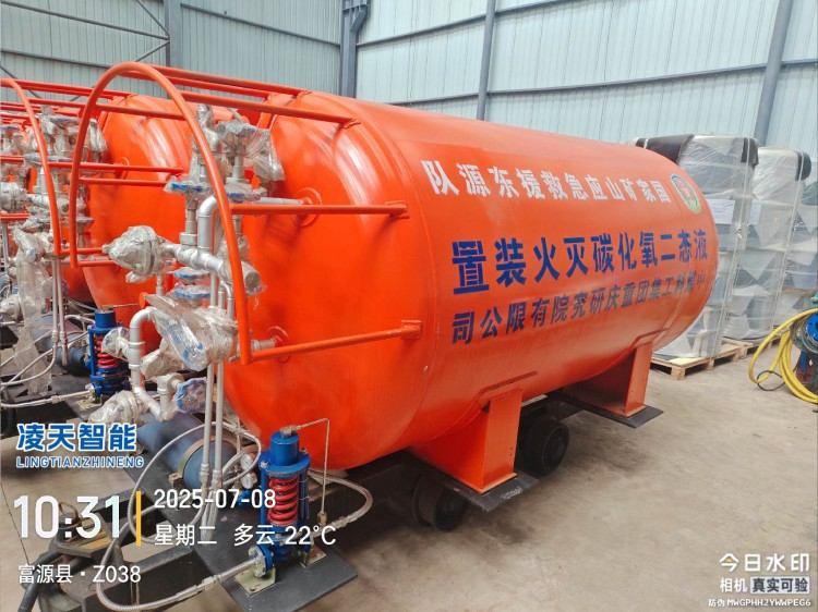 液態(tài)二氧化碳滅火裝置,采用平板車為運載平臺,搭載液態(tài)二氧化碳滅火模塊,采用液態(tài)二氧化碳為滅火劑,運輸至井下火區(qū)近附,經(jīng)自增壓調(diào)控系統(tǒng)實現(xiàn)罐內(nèi)穩(wěn)壓,并通過遠距離輸送管路將液體從罐內(nèi)向密閉火區(qū)噴射,利用其急速膨脹氣化和吸熱效率高的物理特性,可實現(xiàn)惰性降氧,吸熱降溫,吸附阻化等功能,從而可快速進行井下煤層自燃火災的預防與撲滅等。