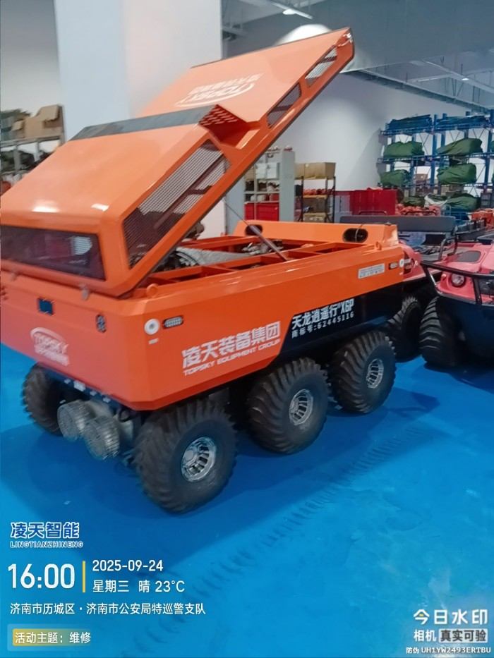 水陸兩棲 采用6×6輪式+履帶底盤,液壓驅(qū)動,水陸兩棲,可全地形行駛。可在水上漂浮行進(jìn),適合多種救援場景,輪胎+履帶兩用底盤(履帶可快速拆裝)。
