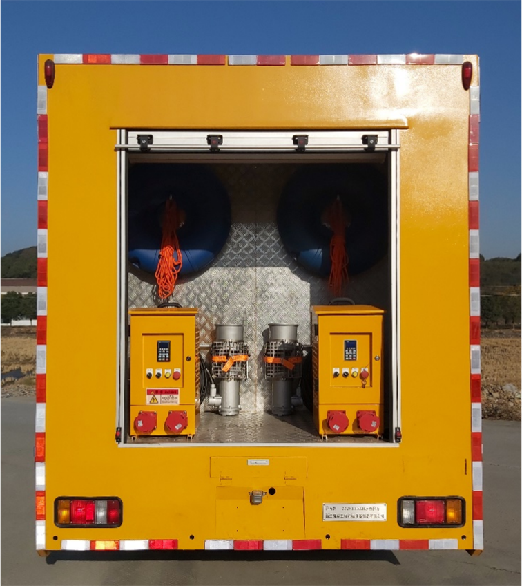 單排排澇車(1200m3),是在慶鈴二類汽車底盤的基礎上依據排水車的特點,配置柴油發電機組、兩臺大流量便攜式潛水泵及控制系統、照明系統等設備改裝成型的專項作業車。整車尺寸較小,通過性較強,廣泛適用于各類搶險現場。