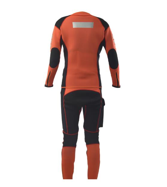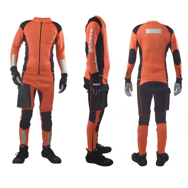 水域救援專(zhuān)用分體式濕式服,前開(kāi)拉鏈長(zhǎng)袖上衣和中腰褲兩件套。3mm高彈氯丁橡膠面料制作,相拼3mm超彈氯丁橡膠面料,有效的提升運(yùn)動(dòng)的自由度。無(wú)極調(diào)節(jié)尼龍戰(zhàn)術(shù)腰帶和高強(qiáng)度塑鋼插扣,防止衣服滑落。右腿外側(cè)設(shè)有一個(gè)防水尼龍面料立體口袋,臀部一片式、護(hù)膝、護(hù)肘易摩擦部位,均采用彈性聚酯纖維復(fù)合面料,增加救援服的耐磨性。衣袖、褲口及背后都設(shè)有彈性反光帶。領(lǐng)口、袖口及褲口處YKK拉鏈開(kāi)合。