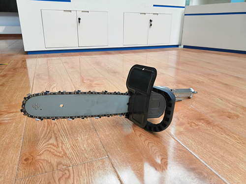 PJQL-4 礦用氣動鋸(以下簡稱氣動鋸),是我公司經過多年的探索,在機電、通風、采煤等各科室的高技術素質科技人員的通力合作下,為煤礦開發出的礦用切割與開槽工具。氣動鋸由鋸頭、鏈條、聚氨酯軟管三大部分組成,聚氨酯軟管將氣源和氣動鋸連接起來,氣源提供的氣壓驅動氣動鋸高速運轉,進行切割。工作時,冷卻水通過導板中間的孔流向切割部位,起到冷卻和降塵的作用。并且具備雙重斷水保護功能,氣動鋸在切割時采取了濕法切割水冷卻,以避免切割時出現火花??捎糜诓删蚬ぷ髅媸褂玫拿簩印r石切割,用于密閉墻的砌筑,也可用于礦山救援時的混凝土與巖石破拆。