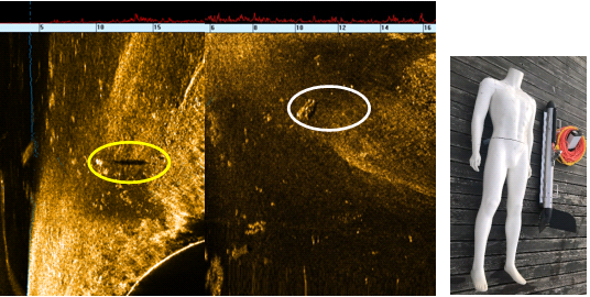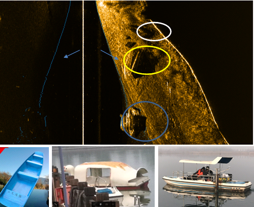 其中,藍色箭頭指向藍色線條為自動檢測的水底線,三艘沉船,分別對應實物如下,小船約為3米長,大船約為5米長。