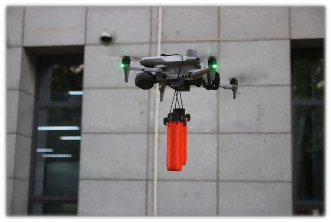 一款具備紅藍爆閃燈和拋投器的二合一裝備。能在惡劣氣候條件下可靠工作,通過接口,可掛載在無人機上使用,具備底部5秒快速安裝的能力,具備2段拋投功能可實現2個掛載物分別拋投,同時每個拋投點實現2種拋投模式:綁帶拋投,掛線拋投。