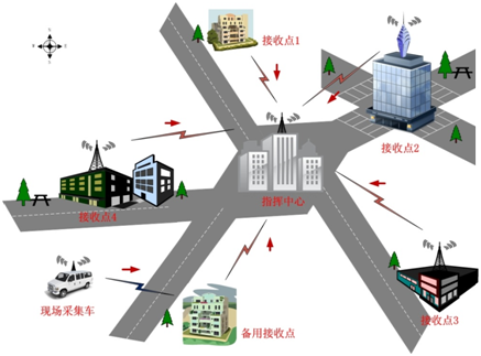 前端現場采集車安裝大功率車載設備在城市各區內巡邏,實時將采集的音視頻信息傳給就近接收點,接收點用微波、光纖或專網等設施傳輸給指揮中心。